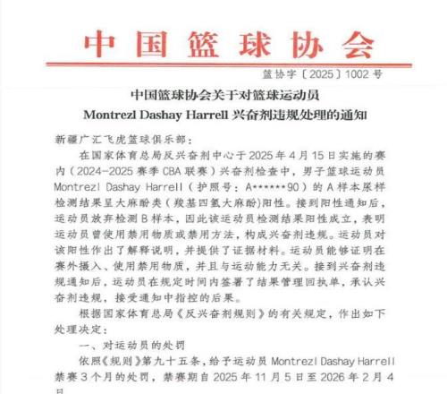 11月6日,篮协公布对上赛季新疆队外援哈雷尔的处罚,由于兴奋剂违规问题,哈雷尔被CBA处禁赛3个月,时间是2025年11月5日至2026年2月4日。球队方面,新疆队需要承担20例兴奋剂检测的费用36000元;对于新疆队的队医、医疗与反兴奋剂负责人吴杰警告处分。
