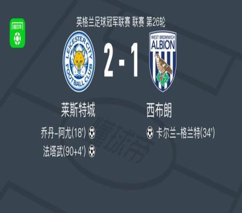 北京时间1月6日英格兰足球冠军联赛 联赛 第26轮,莱斯特城主场对阵西布朗。莱斯特城乔丹-阿尤破门,法塔武破门。西布朗卡尔兰-格兰特破门。最终比分莱斯特城 2-1 西布朗。